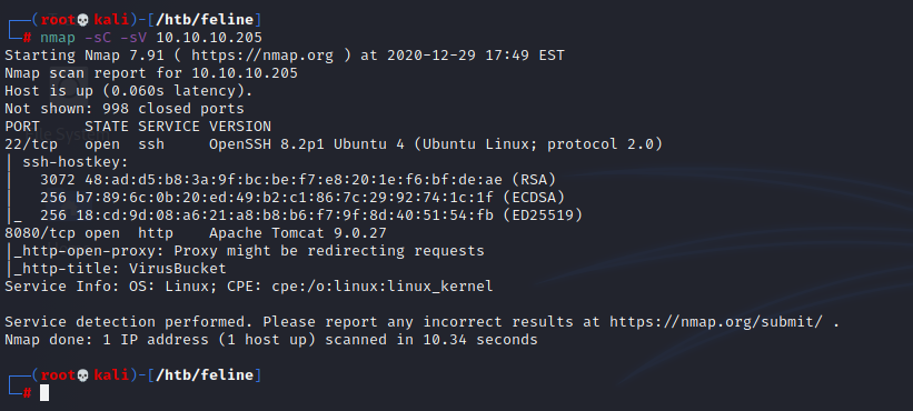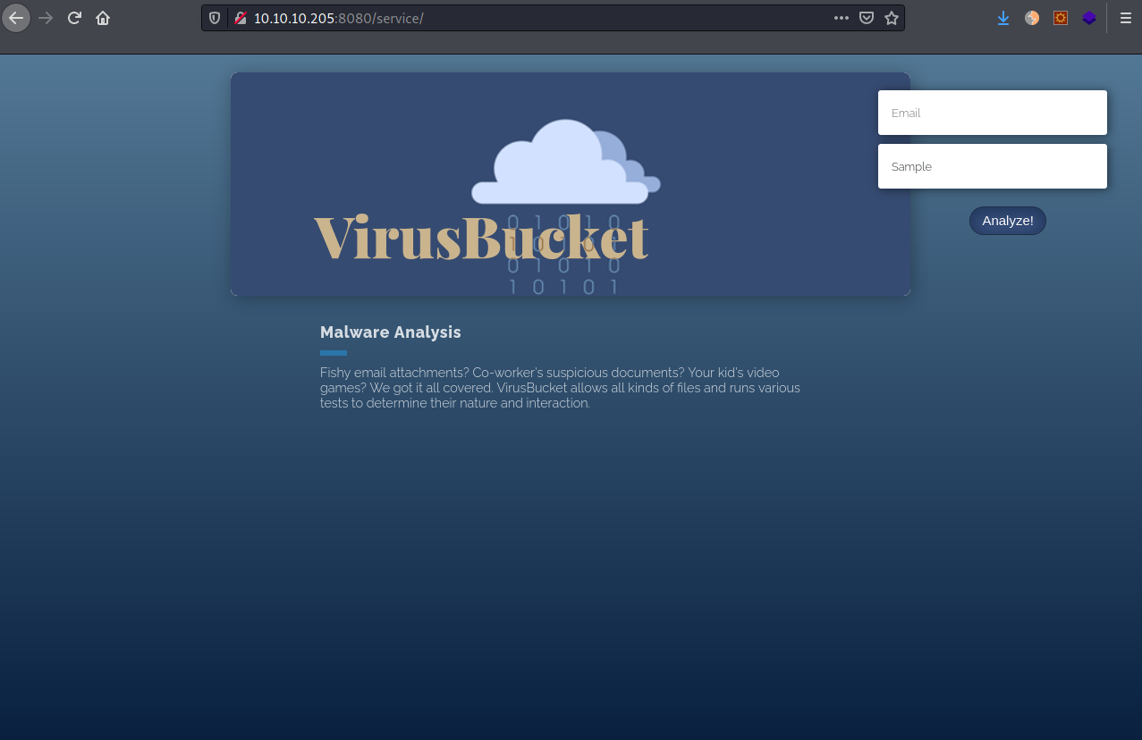 Port 8080 is hosting a VirusBucket service, where we can upload malware samples to analyze.