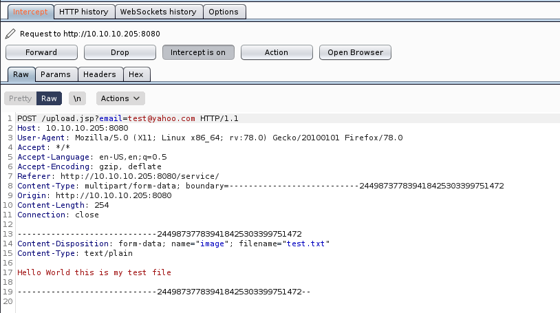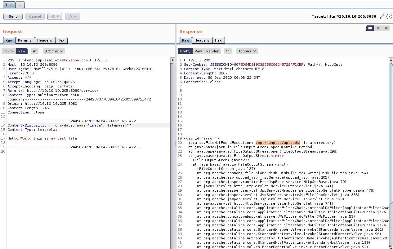 The server posts our data to /upload.jsp, with our file attached as form-data and username in the url. Interestingly, if we feed it a bogus file, we get our current path back.